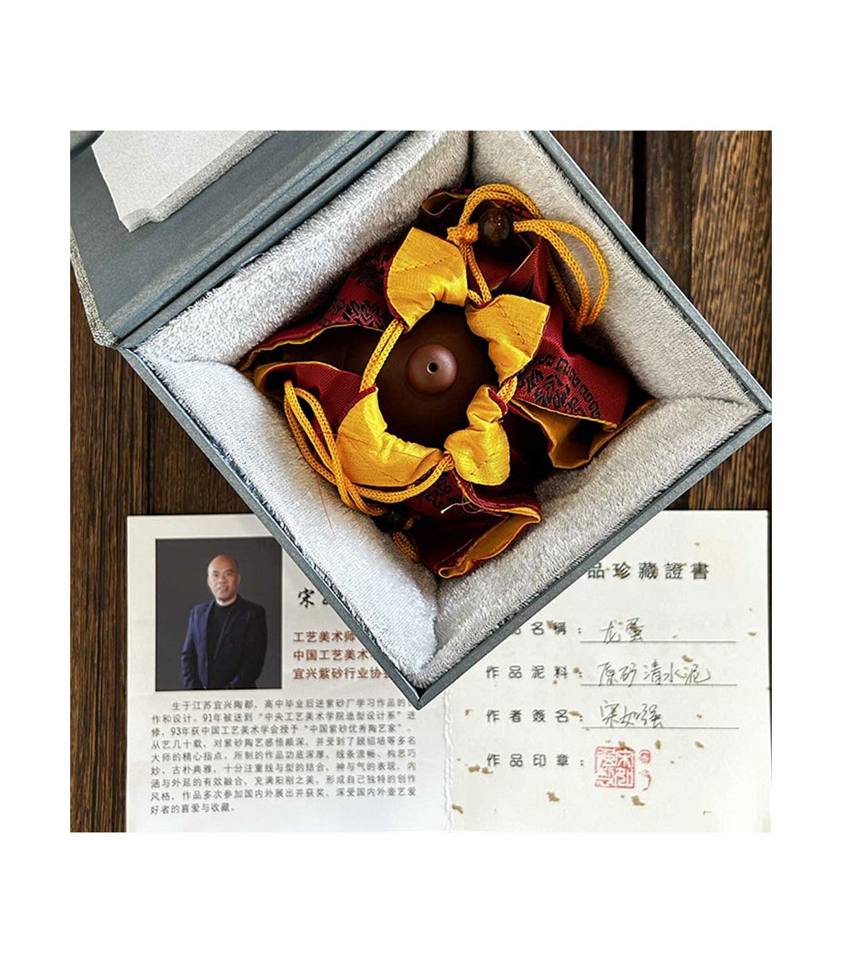 La tetera Yixing Dragon Egg es una creación artesanal con certificación de autenticidad, cuidadosamente empaquetada en su caja original. Mr. Song Ruqiang, maestro de la cerámica Yixing y miembro de la Sociedad de Artes y Oficios de China, es un artesano de gran renombre que ha dedicado su vida al perfeccionamiento de la técnica de la arena púrpura. Sus piezas combinan un diseño sencillo y líneas suaves que aportan tanto funcionalidad como belleza a cada sesión de té.