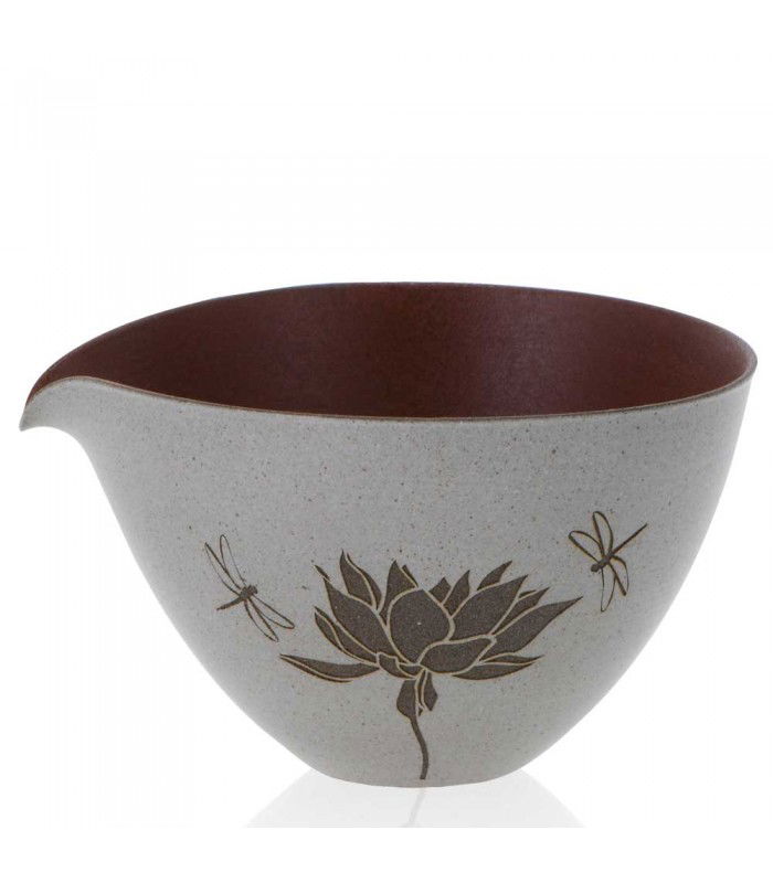 Fabricado en barro Yixing sin esmaltar, este Cha Hai hereda las propiedades únicas de este material, famoso por su alta porosidad y capacidad para "memorizar" las infusiones previas. Esto significa que, con el tiempo, el Cha Hai contribuirá a intensificar los sabores de tu té favorito. Su exterior está decorado con un grabado en relieve de flores de loto y libélulas, simbolizando la pureza y la tranquilidad de la naturaleza, lo que añade un toque de serenidad y belleza a tu ritual del té.