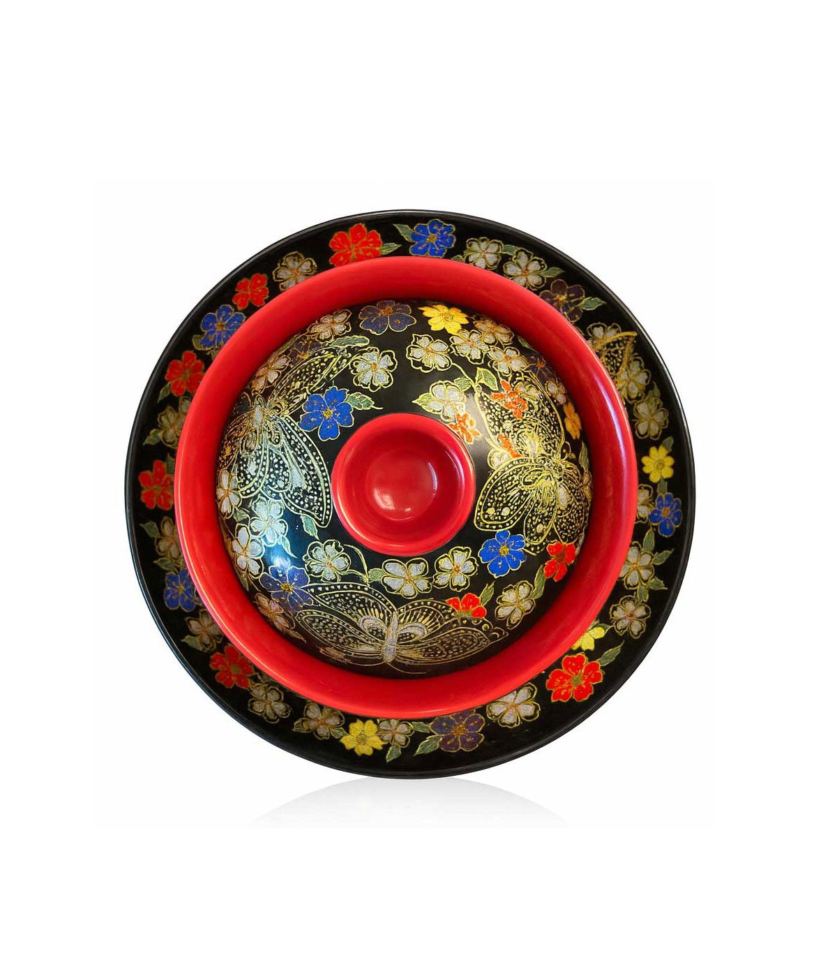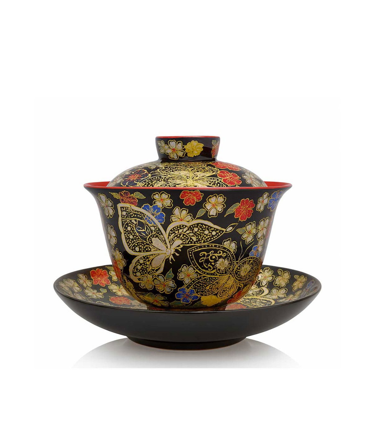 Pero es su acabado artesanal lo que lo hace realmente especial. Cada pieza está decorada a mano con un motivo de mariposas y flores que combina grabados dorados, rojos intensos, azules eléctricos y toques plateados sobre fondo negro satinado. Este contraste, que recuerda a la iridiscencia de las alas de una mariposa Morpho, da nombre al modelo. Ningún gaiwan es idéntico a otro: cada pincelada, cada detalle, lo convierte en una pieza única.