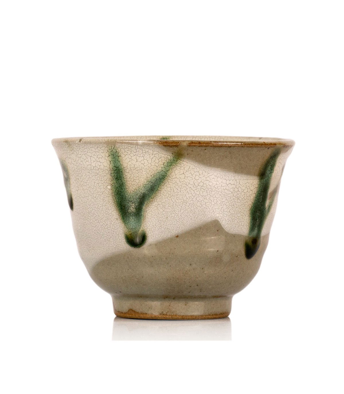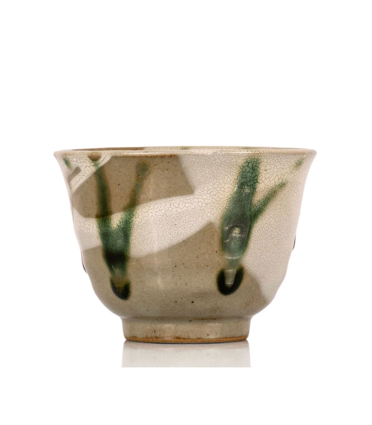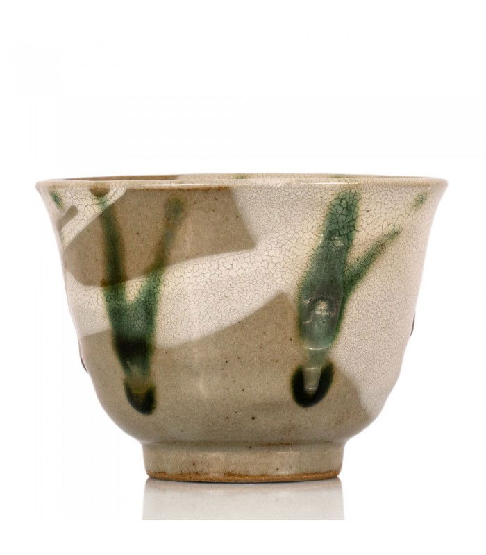 El esmalte, que se extiende en tonos de blanco y verde vibrante sobre la superficie craquelada, refleja una estética rústica que resalta la naturalidad de la pieza. Este vaso está creado para elevar la degustación del té a un acto de contemplación y apreciación estética..