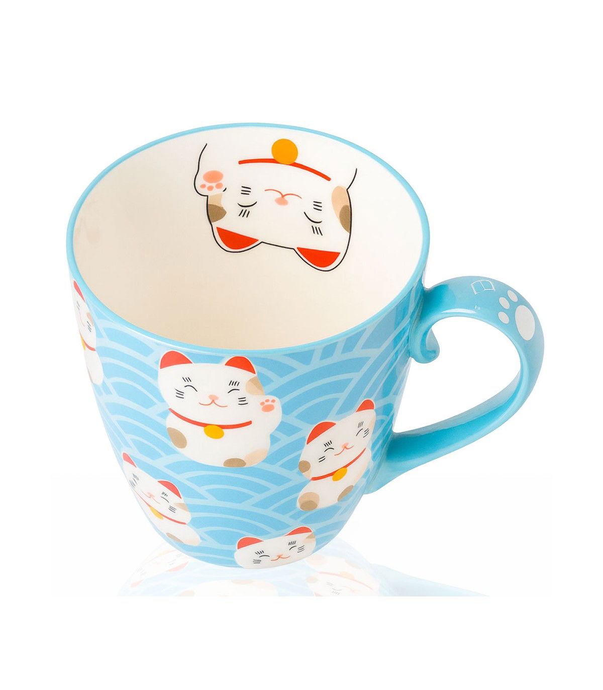 Su decoración está inspirada en el Maneki Neko, el conocido "gato que saluda", símbolo de buena suerte, prosperidad y protección en Asia. Con su patita levantada y su expresión amigable, el Maneki Neko se ha convertido en un icono del optimismo cotidiano. En esta taza, se presenta repetido sobre un fondo azul con motivos ondulados que recuerdan al mar o a los techos tradicionales japoneses, creando un contraste alegre y visualmente armonioso.