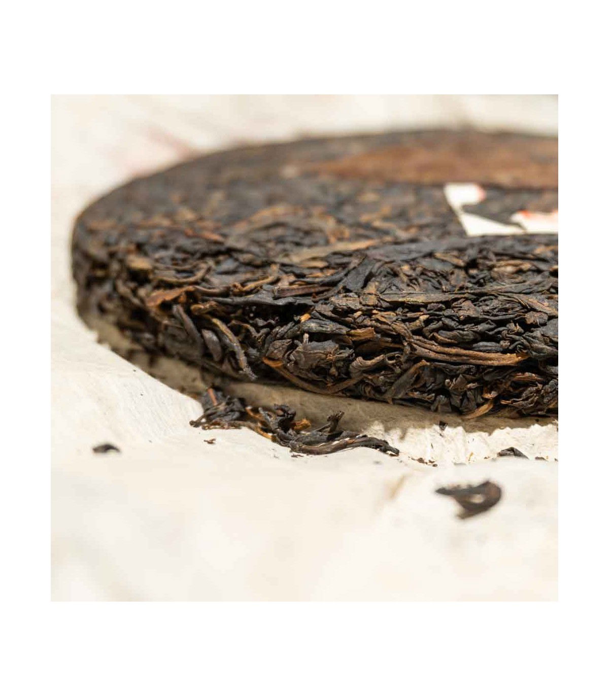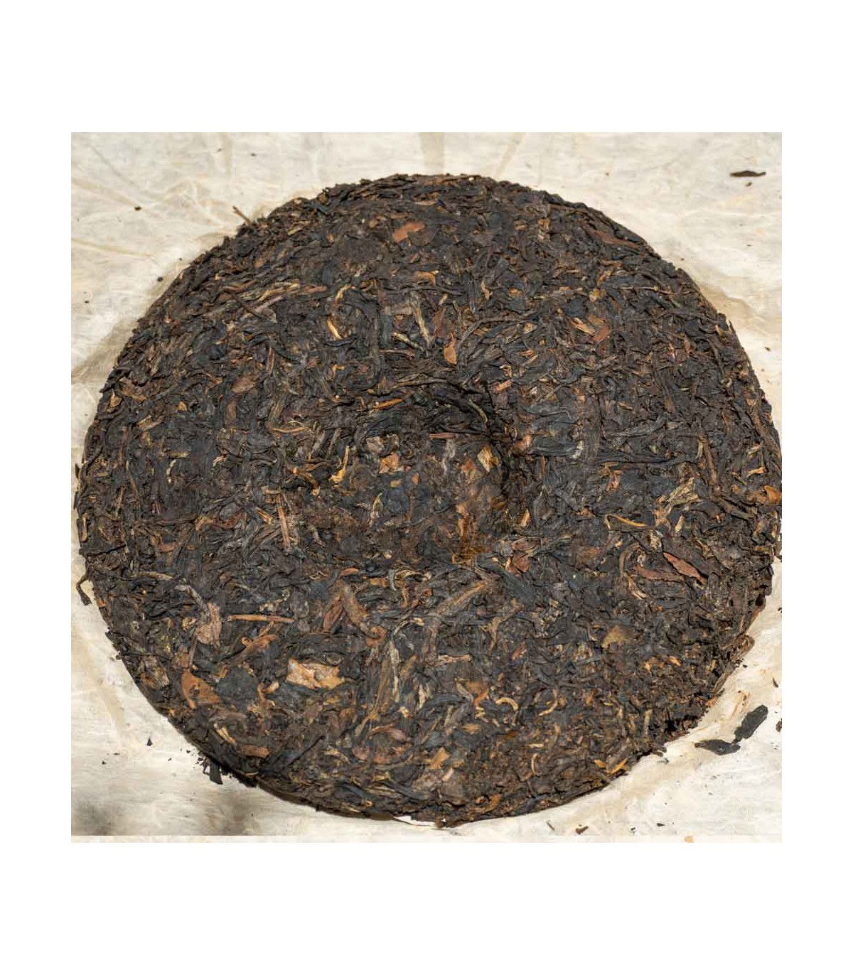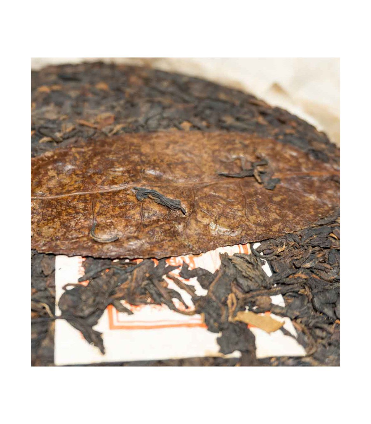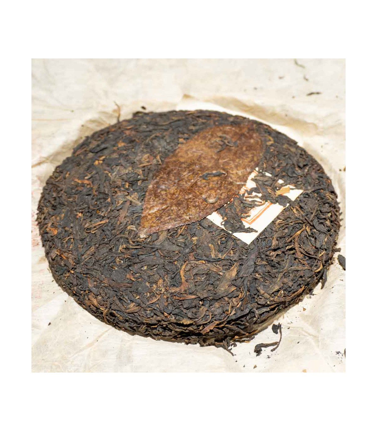 El envoltorio, castigado por los años, no es lo más bónito de este té, pero una vez accedemos a su interior, rápidamente se olvida cuando encontramos un disco perfecto, con unas hojas muy bien trabajadas con un color amarronado que nos hacen pensar que tiene mucha más edad. En la superficie, nos encontramos una gran hoja que nos remonta a los origenes del té.