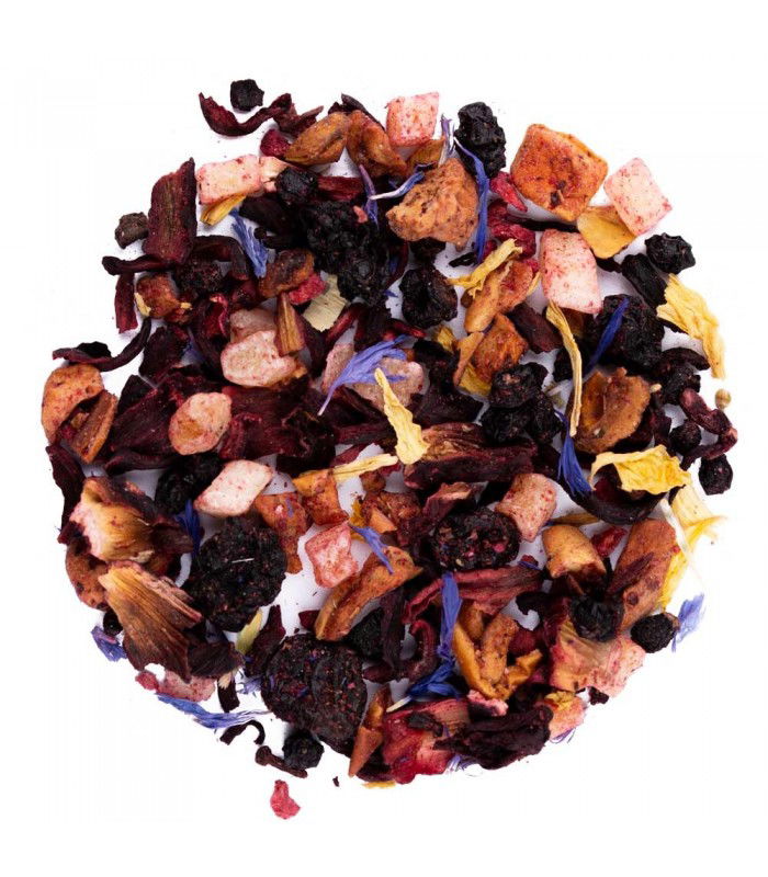 Flor de hibisco, trozos de manzana, cubitos de papaya (Papaya, azúcar), pasas de corintio, bayas de sauco, grosella negra, aroma, trocitos de frambuesa liofilizados, trocitos de fresa liofilizada, flor de girasol, flor de aciano azul.