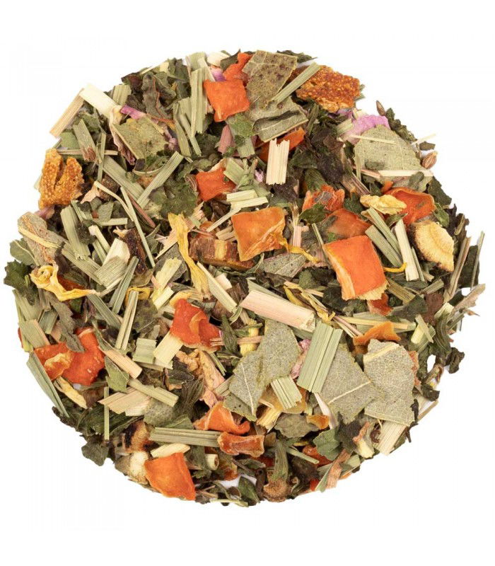 Cada sorbo es una caricia a los sentidos que te invita a relajarte y desconectar. La melisa, con su dulzura floral, se une a la zanahoria, aportando un toque terroso y naturalmente dulce. El lemongrass y las mentas frescas crean una sinfonía de aromas que revitalizan tus sentidos, mientras que el regaliz y el anís envuelven tu paladar en una suave caricia.