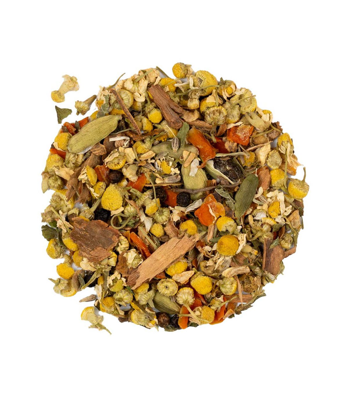 La manzanilla, directamente traída de las fértiles tierras de Croacia, sirve de base a esta obra maestra. Su dulzura natural y su capacidad para relajar la mente y el cuerpo la convierten en el candidato perfecto para una infusión de noche o después de comidas pesadas. Pero no nos detuvimos ahí. Hemos enriquecido esta base con un bouquet de especias seleccionadas minuciosamente para elevar la experiencia: