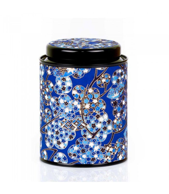 Esta lata es especialmente llamativa a la par que discreta por su colorido y decoración. Sobre la base de lata negra brillante, se acopla de manera artesanal esta lámina de papel Washi con un impecable diseño que combina los azules y los dorados.