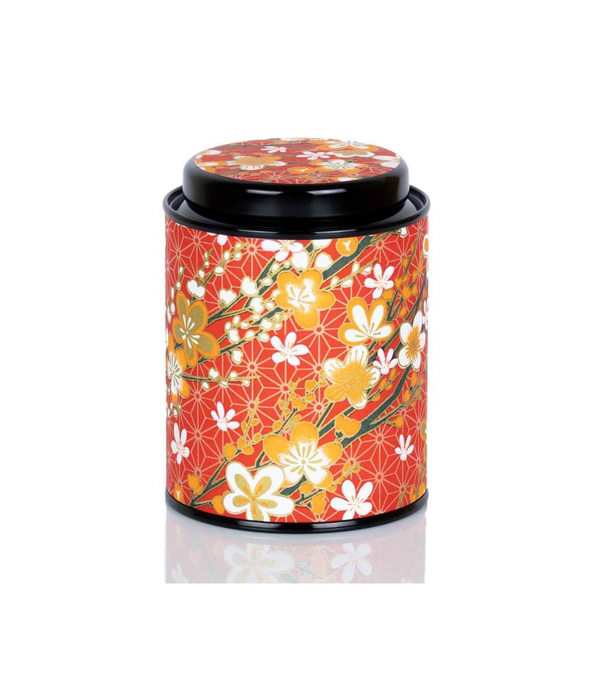 Esta lata es especialmente llamativa a la par que discreta por su colorido y decoración. Sobre la base de lata negra brillante, se acopla de manera artesanal esta lámina de papel Washi con un impecable diseño que combina los rojos y los dorados y numerosos motivos Japoneses que las hacen especialmente llamativas.