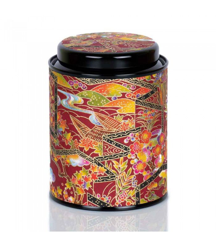 Esta lata es especialmente llamativa a la par que discreta por su colorido y decoración. Sobre la base de lata negra brillante, se acopla de manera artesanal esta lámina de papel Washi con un impecable diseño que combina los rojos y los dorados y numerosos motivos Japoneses que las hacen especialmente llamativas.