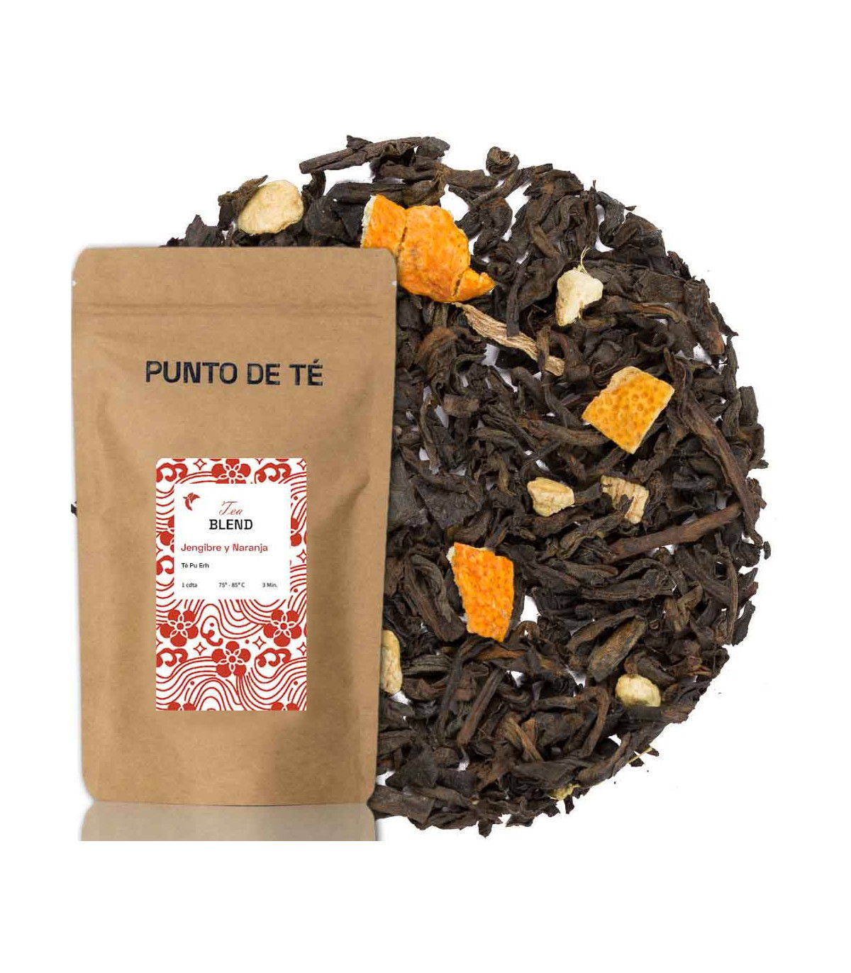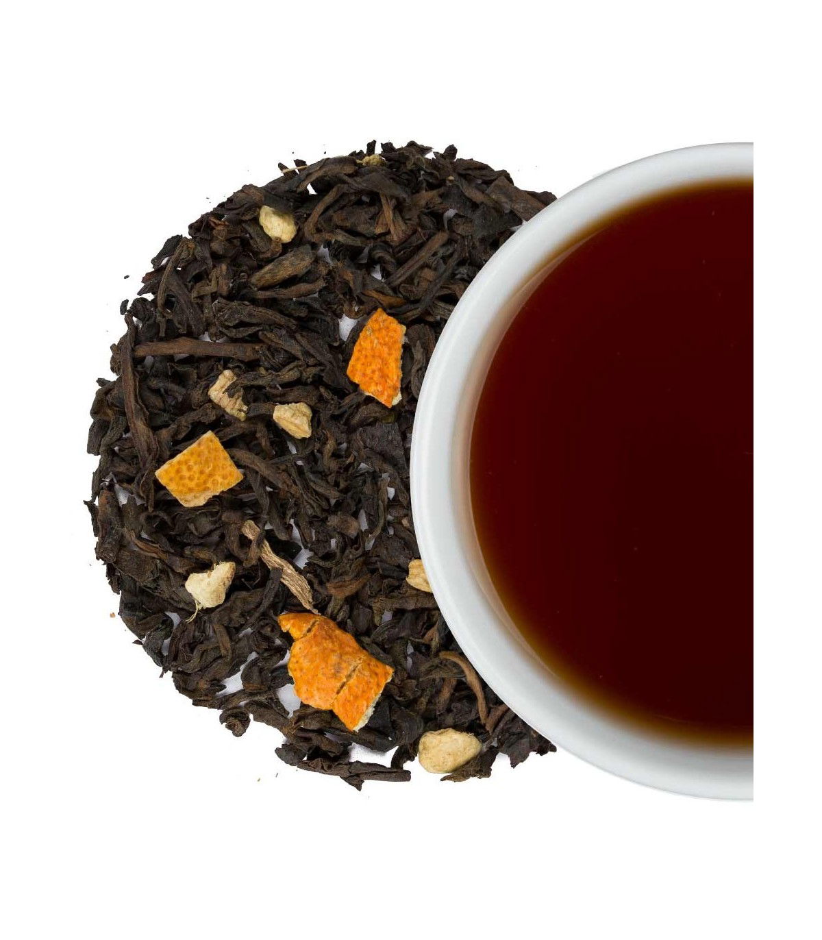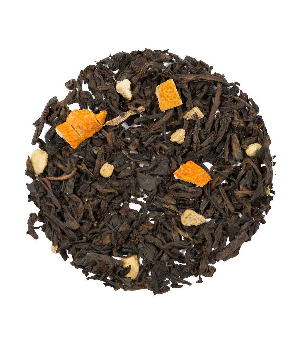 - Té rojo Puerh, Cáscara de naranja, trozos de jengibre y aromas naturales