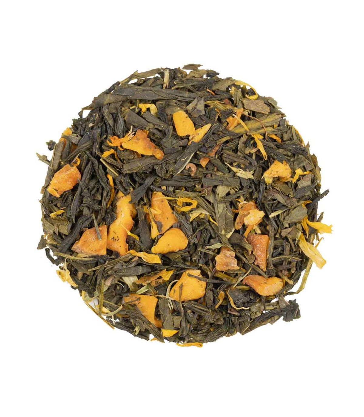 Té Verde Sencha, Trozos de Mango, Caléndula, aromas naturales.