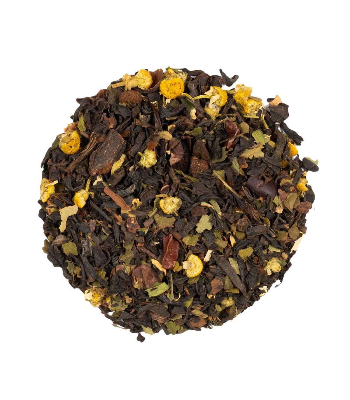- Té Negro, cáscaras de cacao, raíz de achicoria tostada, flores de manzanilla, trocitos de granos de cacao, hojas de zarzamora dulce, menta, aroma, aroma natural de menta
