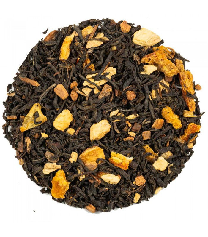 Té Negro de Assam, Canela, Jengibre, Cáscara de Naranja, Aromas naturales.