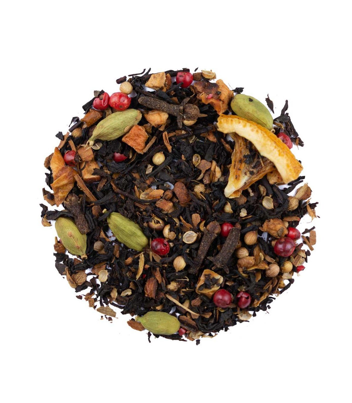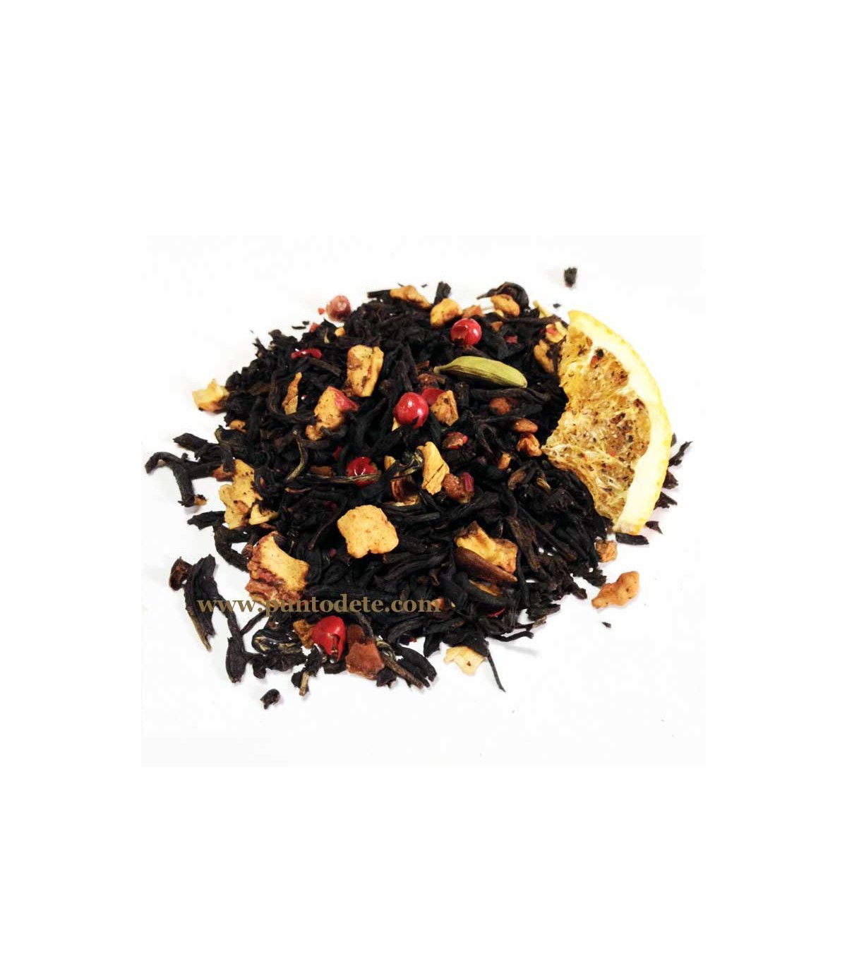 - Té negro (47%), trozos de manzana, trocitos de canela, cilantro, aroma, cardamomo entero, rodajas de naranja, pimienta rosa en grano, clavo