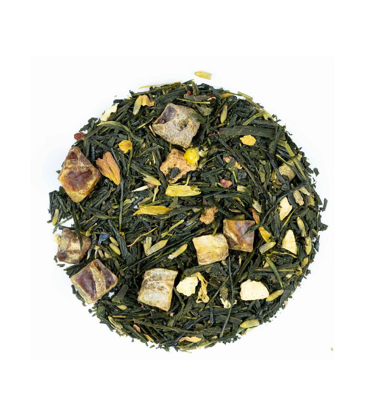 Sencha japonés *, membrillo *, dátil *, manzana *, higo *, naranja *, caléndulas *, cardamomo *, baya de goji *, fresa *, aronia *, arándano *, rosa *, lavanda *, saúco *, malva * aroma natural*