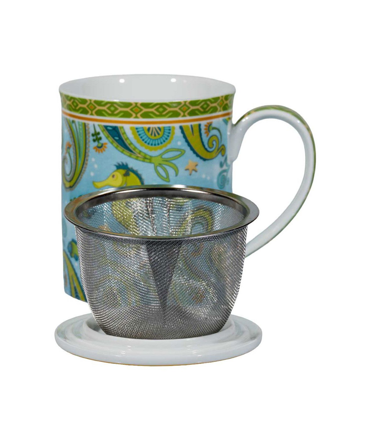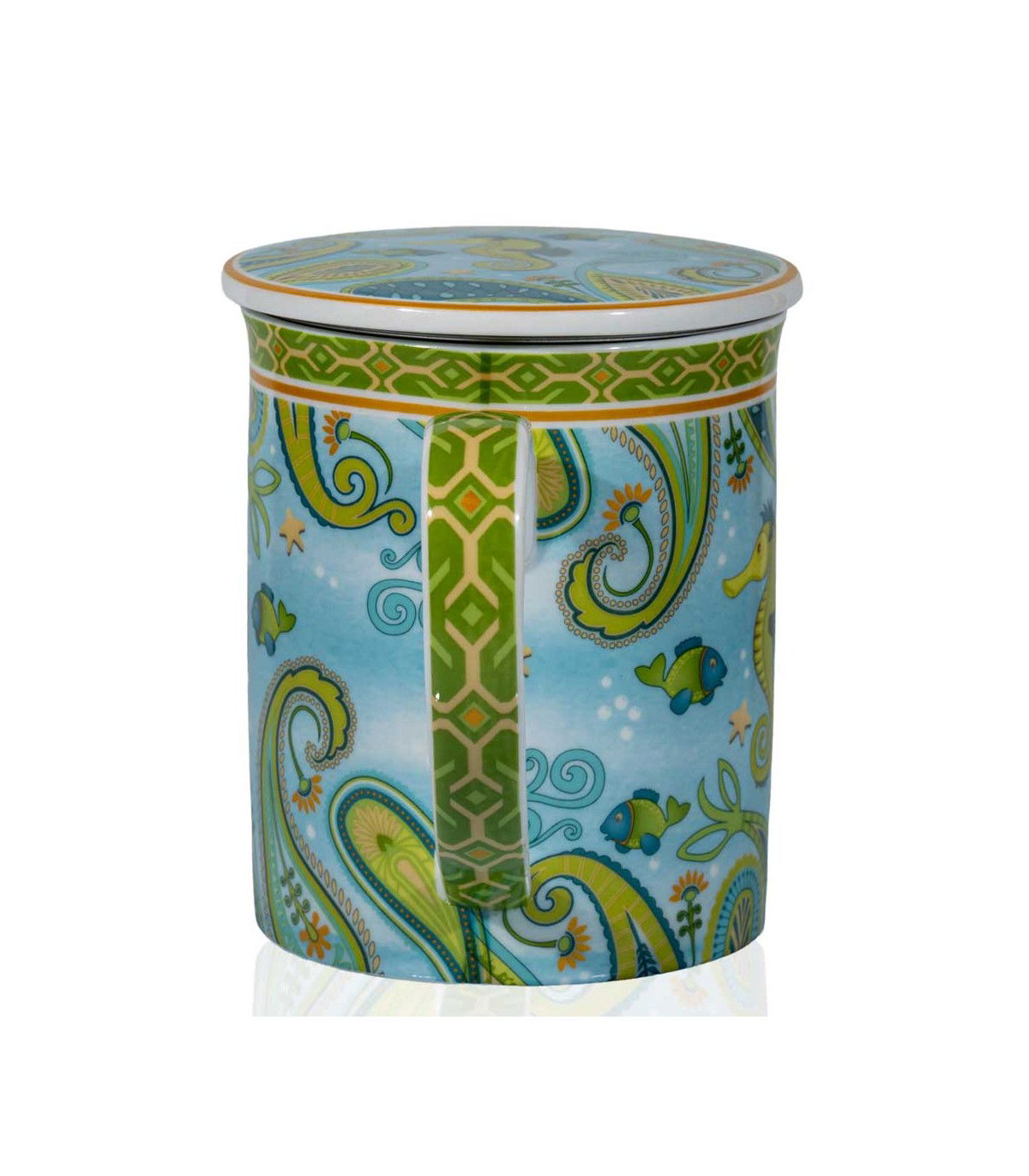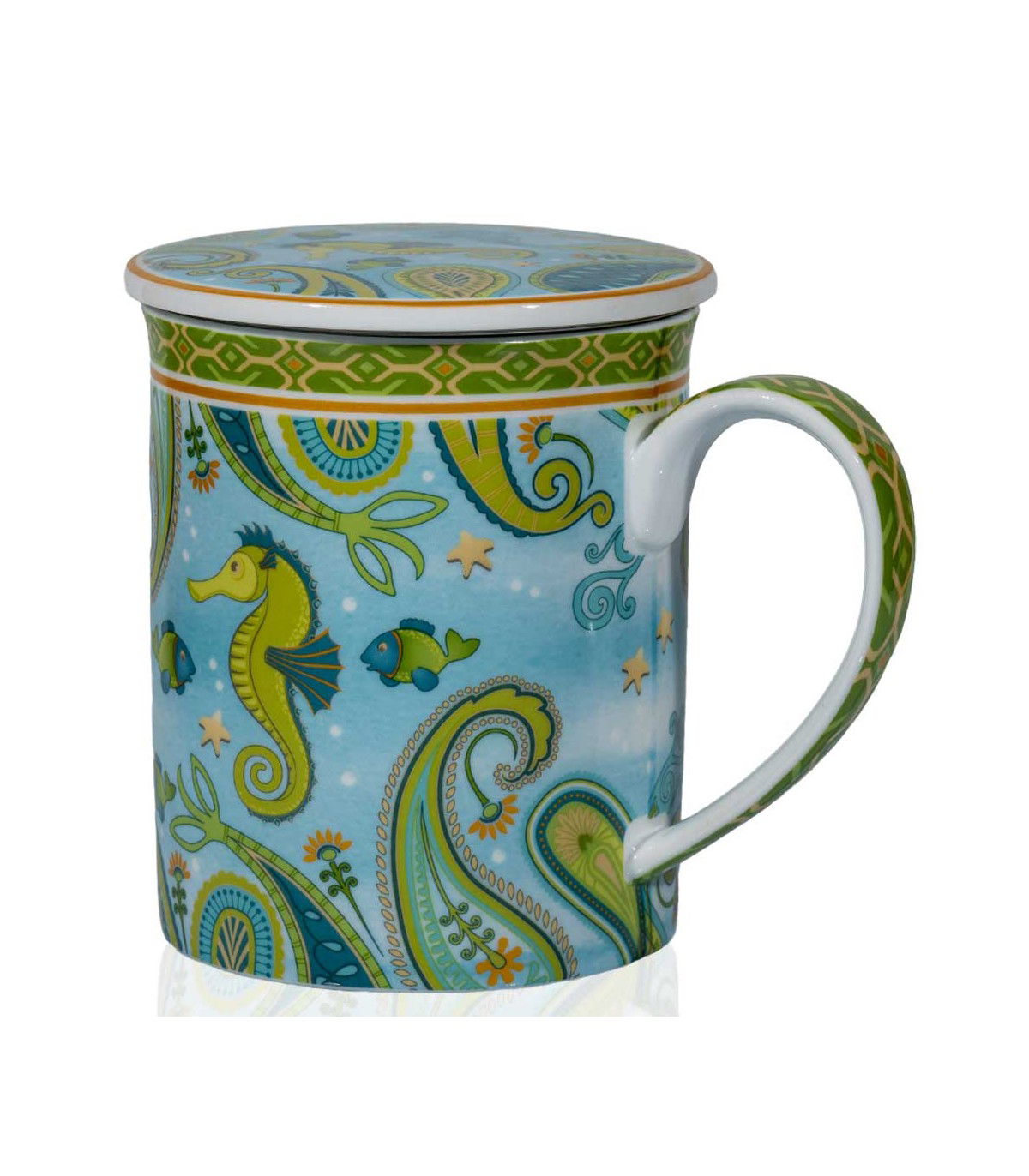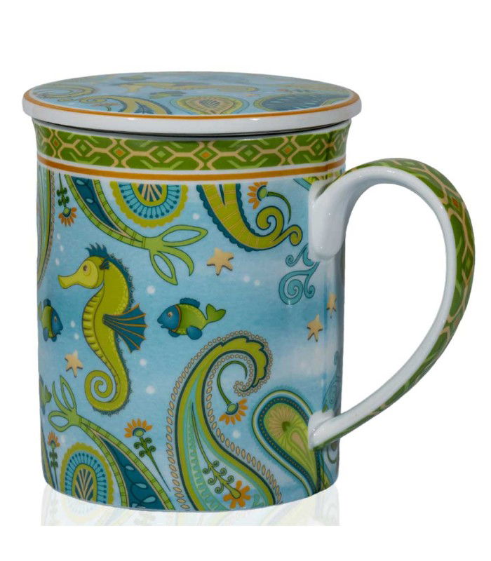 Taza grande de porcelana decorada con motivos marinos. Con filtro de acero inoxidable, ideal para disfrutar de infusiones sin prisas.