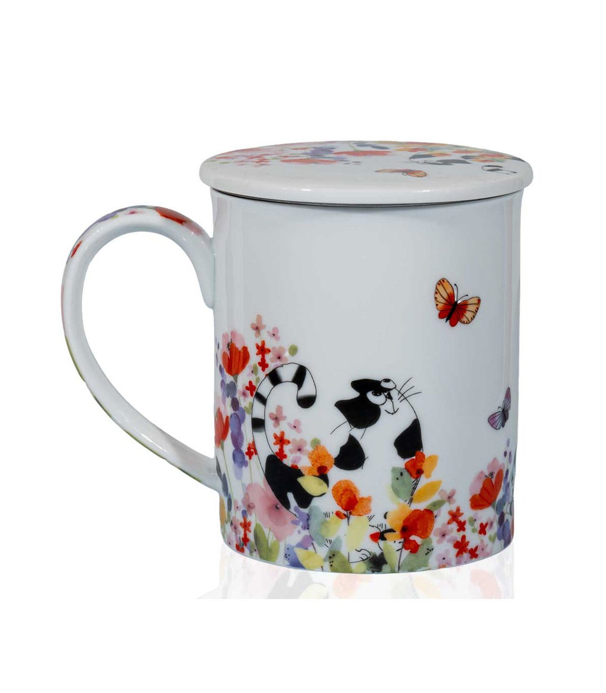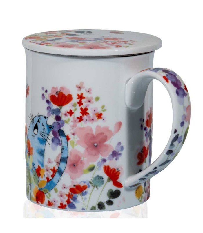 Taza de porcelana decorada con unos simpáticos gatos entre flores. Filtro de acero inoxidable incluido. Ideal para una infusión larga y relajada.