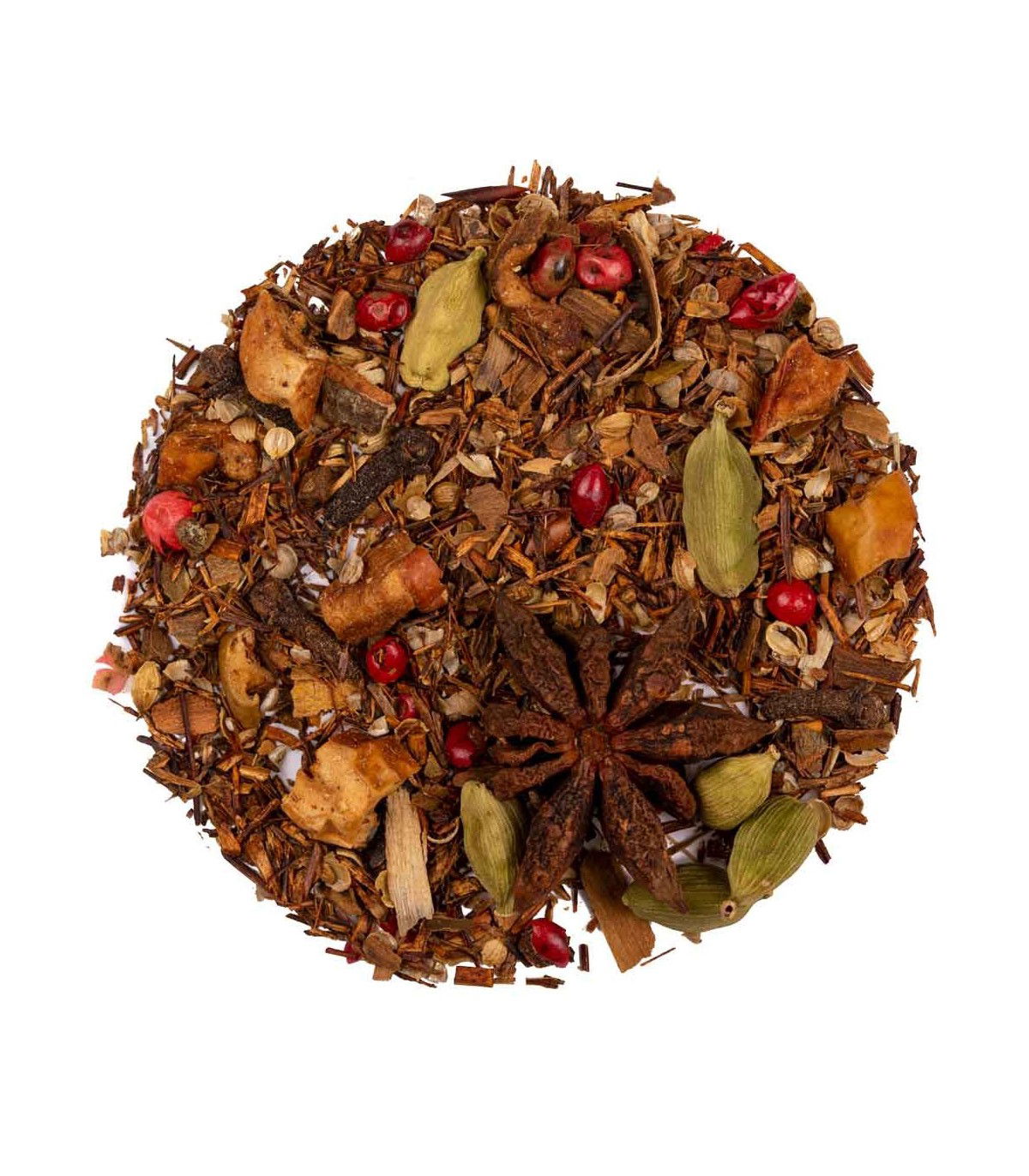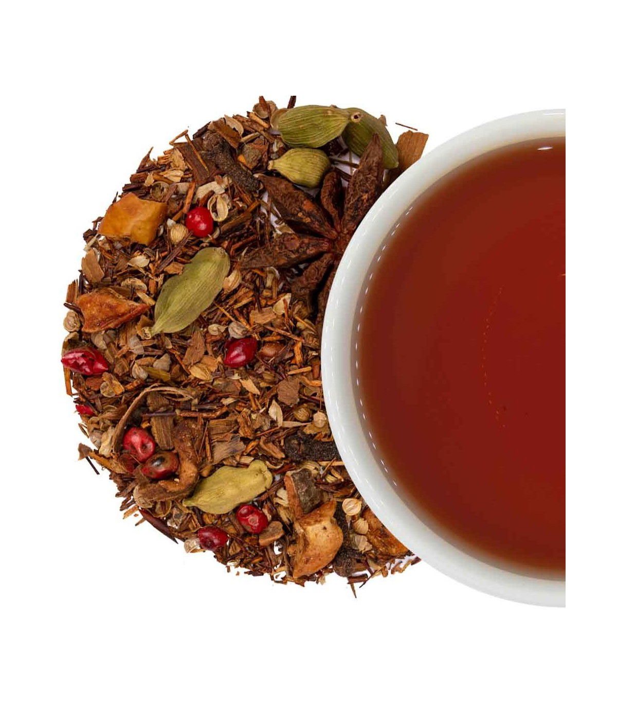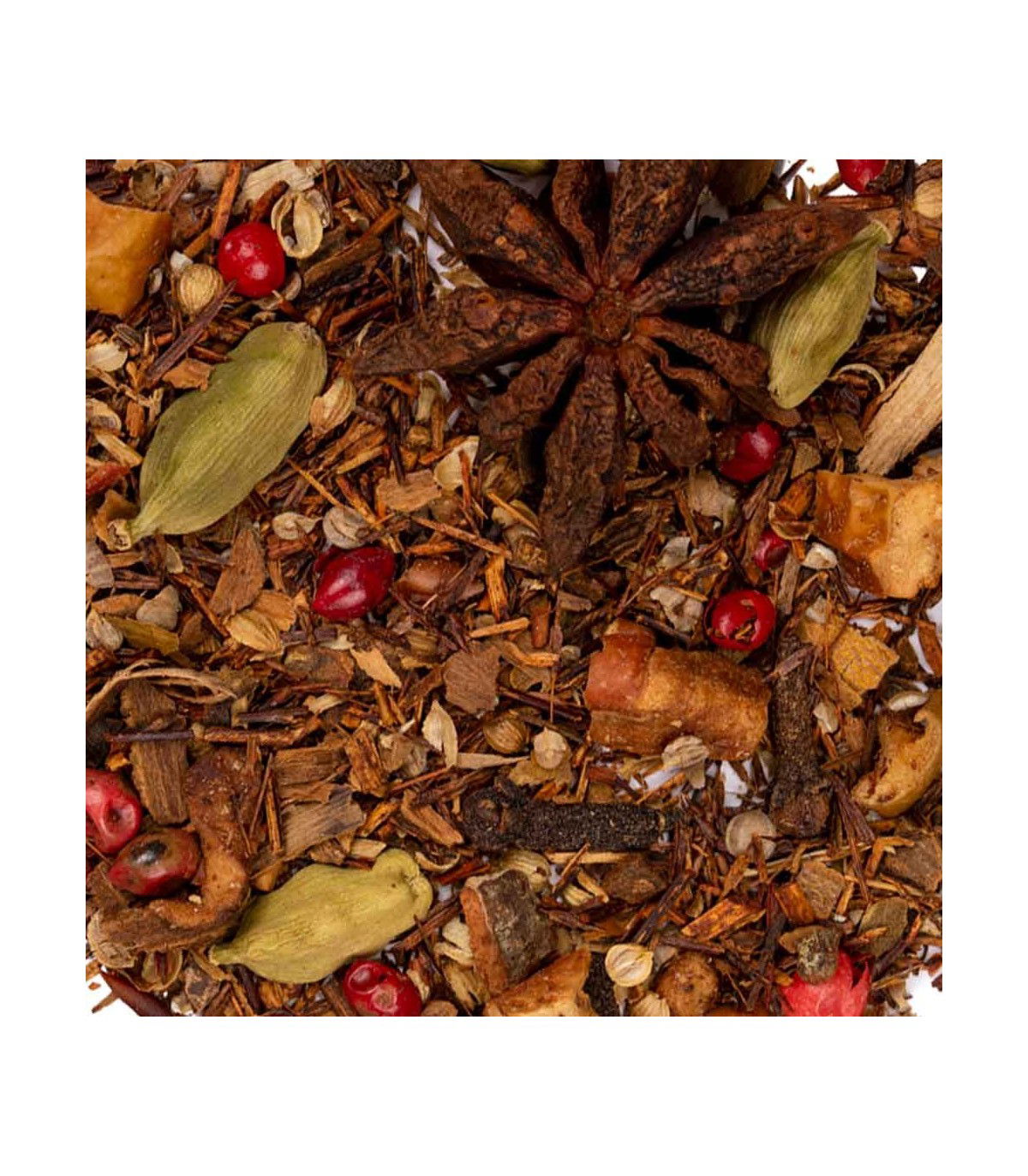 - Rooibos, naranja, canela, clavo, cardamomo, coriandro, aroma natural de vainilla