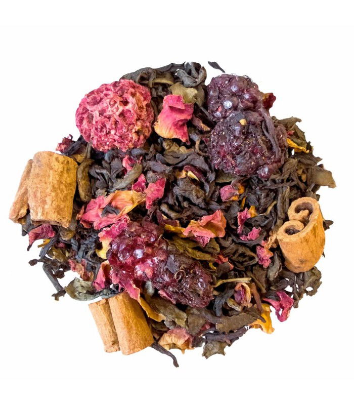 té negro, té verde, corteza de cassia, pétalos de rosa, moras, frambuesas, aroma natural de canela, aroma natural.