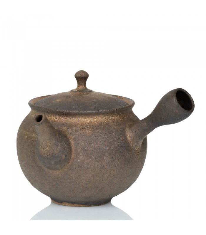 Esta tetera es una muestra. Mientras que los estílos clásicos de Tokoname suelen ser lisos, en esta tetera encontramos una txtura rugosa, rústica y original. La cobertura del barro natural de la zona es una verdadera maravilla, colores ocres se dan cita por todo el contorno, cuanta más luz bañe la tetera, más brillos dorados se despiertan.