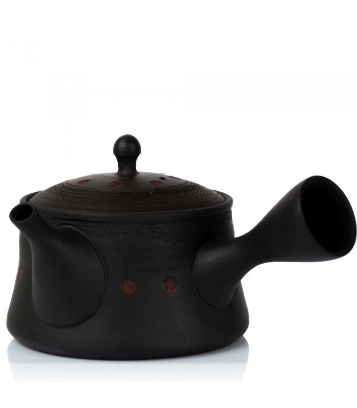 Tetera artesanal de Gyokko en barro Tokoname. Con un diseño elegante en negro y detalles en relieve de flores rojas, esta tetera de 200 ml es ideal para infusiones de té verde japonés. Su filtro integrado asegura un vertido limpio y sin obstrucciones. Hecha a mano, cada pieza es única.