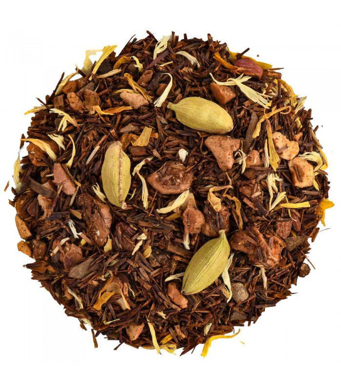 - Rooibos (DOP) (51%), trozos de manzana (tostados), trozos de canela, cardamomo verde (completo con cáscara), aroma, aroma natural, pétalos de caléndula, pétalos de aciano blancos
