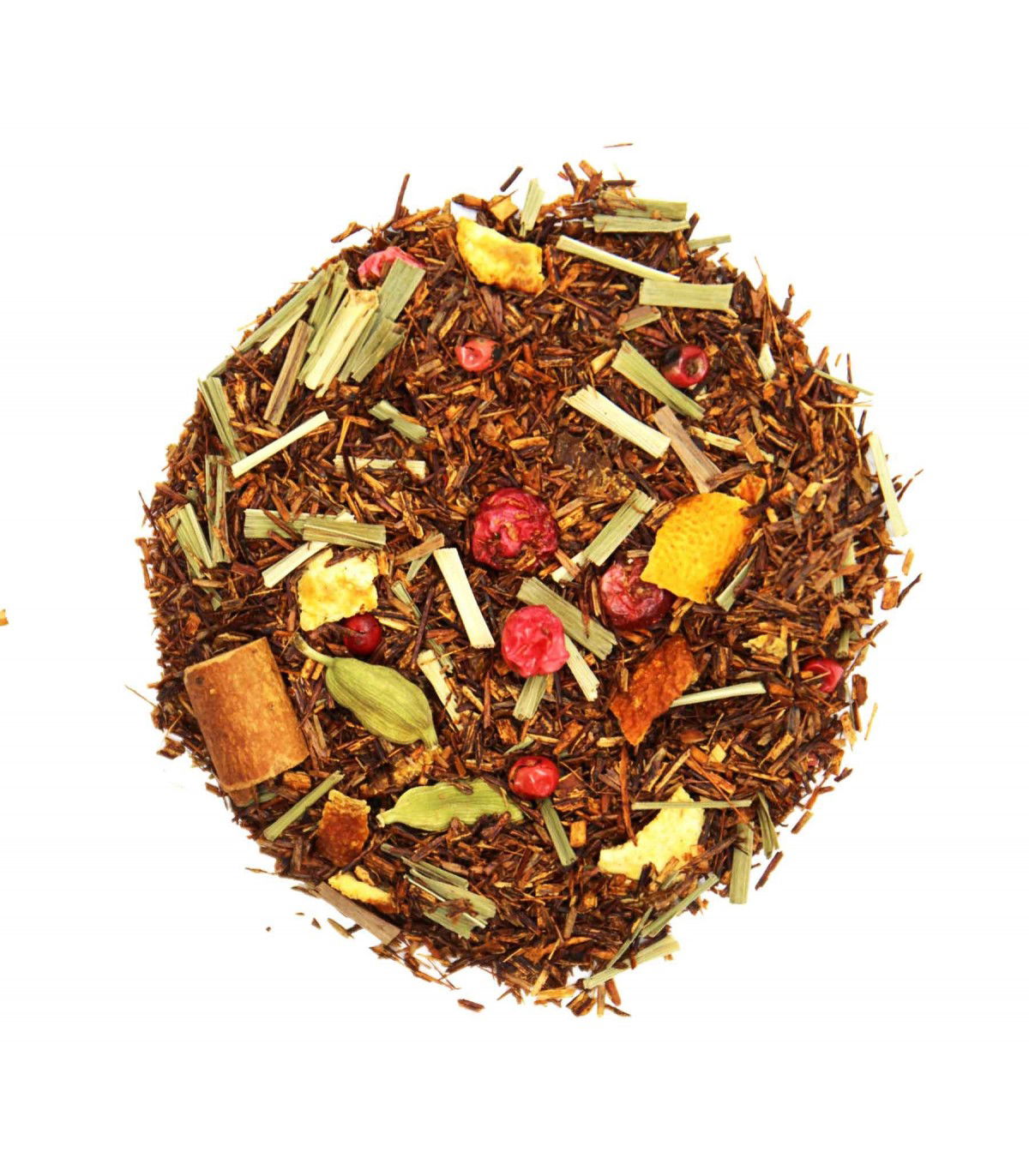 - Rooibos, cáscara de naranja, citronela, canela en rama, aromas, pimienta rosa, grano de cardamomo, grosella liofilizada